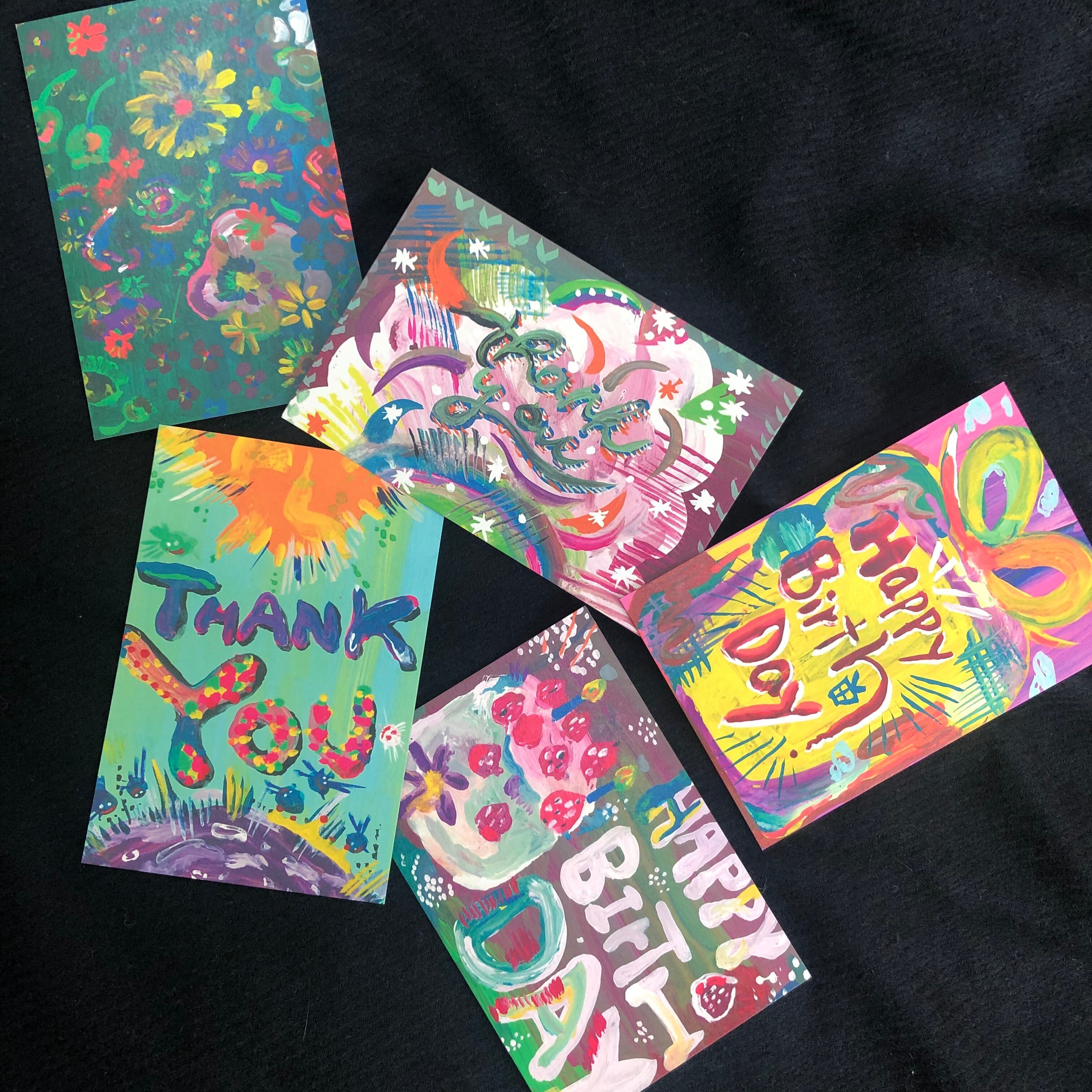 ポストカードのために新しく描きおろしたバースデーデザインとサンキューデザイン。